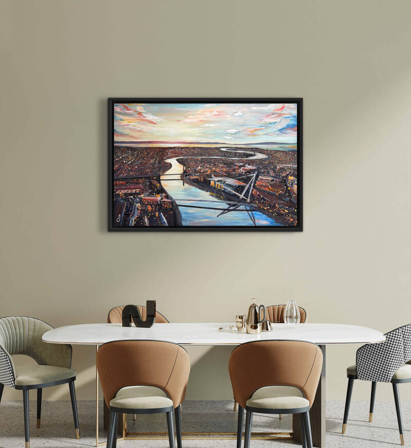 His landscape work showcases a distinct versatility, reimagining iconic Welsh landmarks with a dynamic sense of motion and narrative. A signature element of James’ style is his use of splatter paint, applied deliberately to suggest light, people, or reflections.