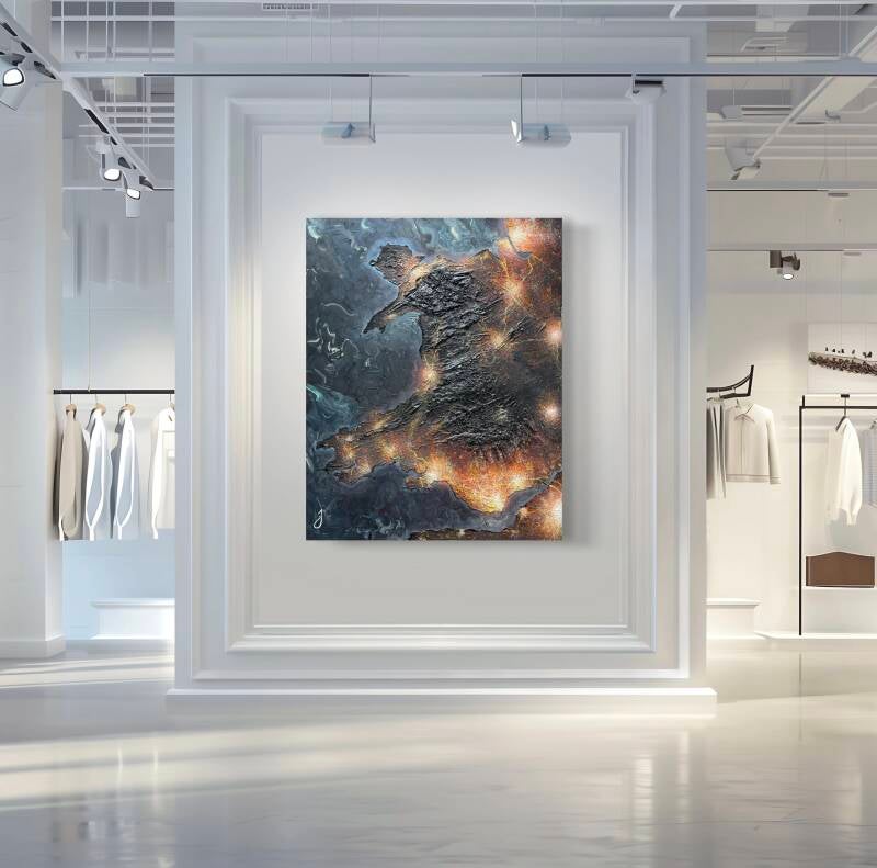 Created with texture and paint on a large 5ft x 4ft stretched canvas, this artwork celebrates the glorious and mountainous landscape of the Land of Song from a satellite view at night.